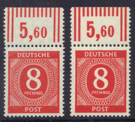 Bei der Nr. 917 ist der Normalfall, das alle Ober- und Unterränder eines Walzenbogens fette Striche und Zahlen zeigen. In einer Teilauflage kommt es aber vor, das nur in Reihe 1 + 2 und auf der rechten Bogenhälfte kleinere, schlanke Zähler und Striche in die Druckplatte eingebaut wurden.