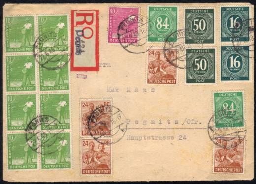 Überfrankierte Vielfachfranktur aus der Währungsreform West mit Nr. 946 Plattenfehler I und II in Einheit.