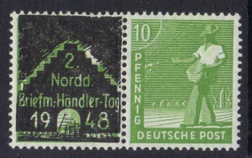 Dieser Überdruck wurde speziell zum "2. Norddeutschen Briefmarken-Händlertag 1948 in Flensburg" hergestellt und stellt das bekannte Flensburger Denkmal "Das Nordertor" dar.