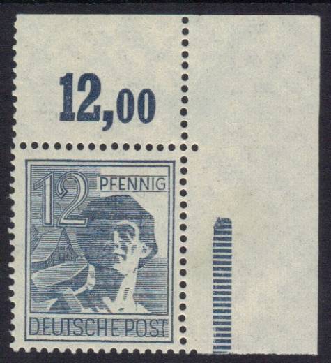 Aus einer Sammlungsauflösung der Arbeiterserie, Eckrandstücke oben mit unterschiedlichen Bogenrandbedruckungen, die die verschiedenen Druckauflagen und Plattenpositionen belegen.