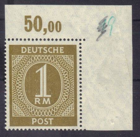 Hierbei erscheinen die eigentlich farblosen Teile der Marke, also hauptsächlich die Ziffer 1 und die Markenränder, um etwa eine halbe Markenbreite nach links versetzt noch einmal als dunkler Schattendruck. Ganz selten einmal erkennt man auch Teile von DEUTSCHE, POST und RM. Das kommt selten vor, auch weil sich beide Drucke teils überlagern.