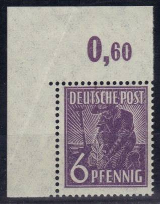 Aus einer Sammlungsauflösung der Arbeiterserie, Eckrandstücke oben mit unterschiedlichen Bogenrandbedruckungen, die die verschiedenen Druckauflagen und Plattenpositionen belegen.
