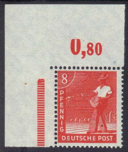 Aus einer Sammlungsauflösung der Arbeiterserie, Eckrandstücke oben mit unterschiedlichen Bogenrandbedruckungen, die die verschiedenen Druckauflagen und Plattenpositionen belegen.