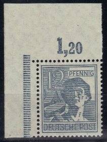 Aus einer Sammlungsauflösung der Arbeiterserie, Eckrandstücke oben mit unterschiedlichen Bogenrandbedruckungen, die die verschiedenen Druckauflagen und Plattenpositionen belegen.