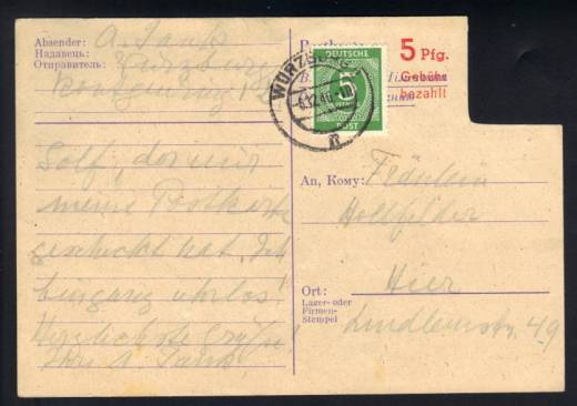 915b EF auf auffrankierter Not-GS PA605 (Ostarbeiterk.-Antwortteil) / Würzburg 6.12.46