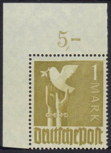 Neuer MICHEL-Plattenfehler 959 I " waagerechter Strich im oberen Bildrand über dem Taubenflügel. " von Feld 1 einer Teilauflage, in der Variante mit langem Strich bis zur rechten Bildecke!