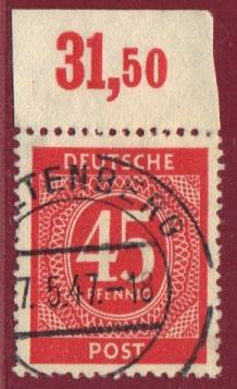 Die "Nähmaschinenzähnung" entstand, wenn zu viele Bögen auf einmal in die Zähnungsmaschine eingelegt wurden und durch stark abgenutzte Zähnungskämme. In einigen Auflagen aber auch durch die Lieferung von ungeeignetem, dickem und faserigem Papier. Die untersten Bögen im Stapel hatten dann die vorliegende Zähnung, bei der die Zahnlöcher nicht richtig ausgestanzt wurden und die fast den Eindruck erweckt, als wäre sie auf einer Nähmaschine erstellt worden. In aller Regel findet man diese Zähnungsvariante nur in den frühen Auflagen des Plattendrucks mit Hausauftragsnummern aus dem Jahre 1945 und 1946. Vermutlich waren der Zeitdruck und die Menge dieser Auflagen so hoch, das man einfach versuchte durch das Einlegen von mehr Bögen, Zeit zu sparen.